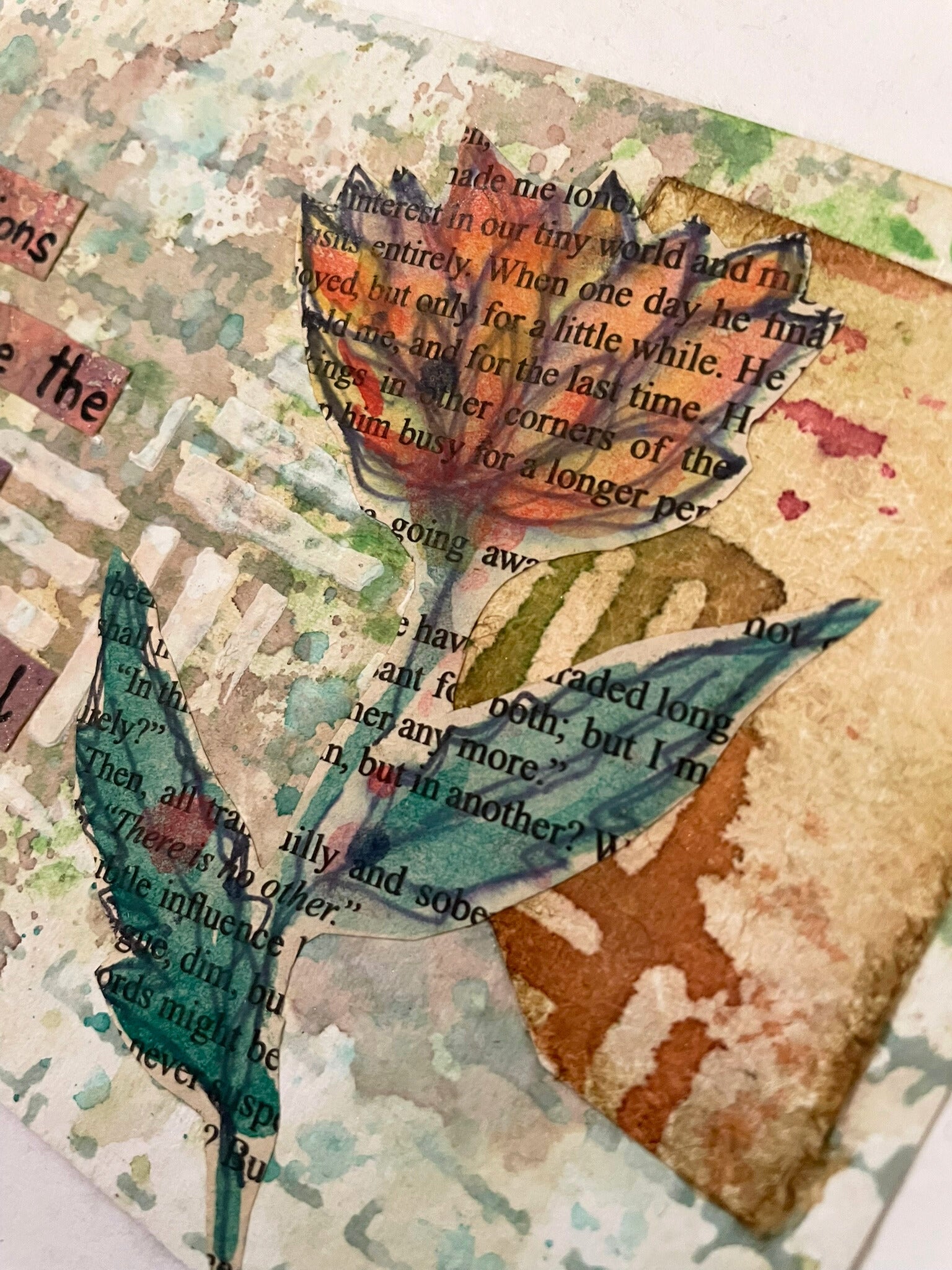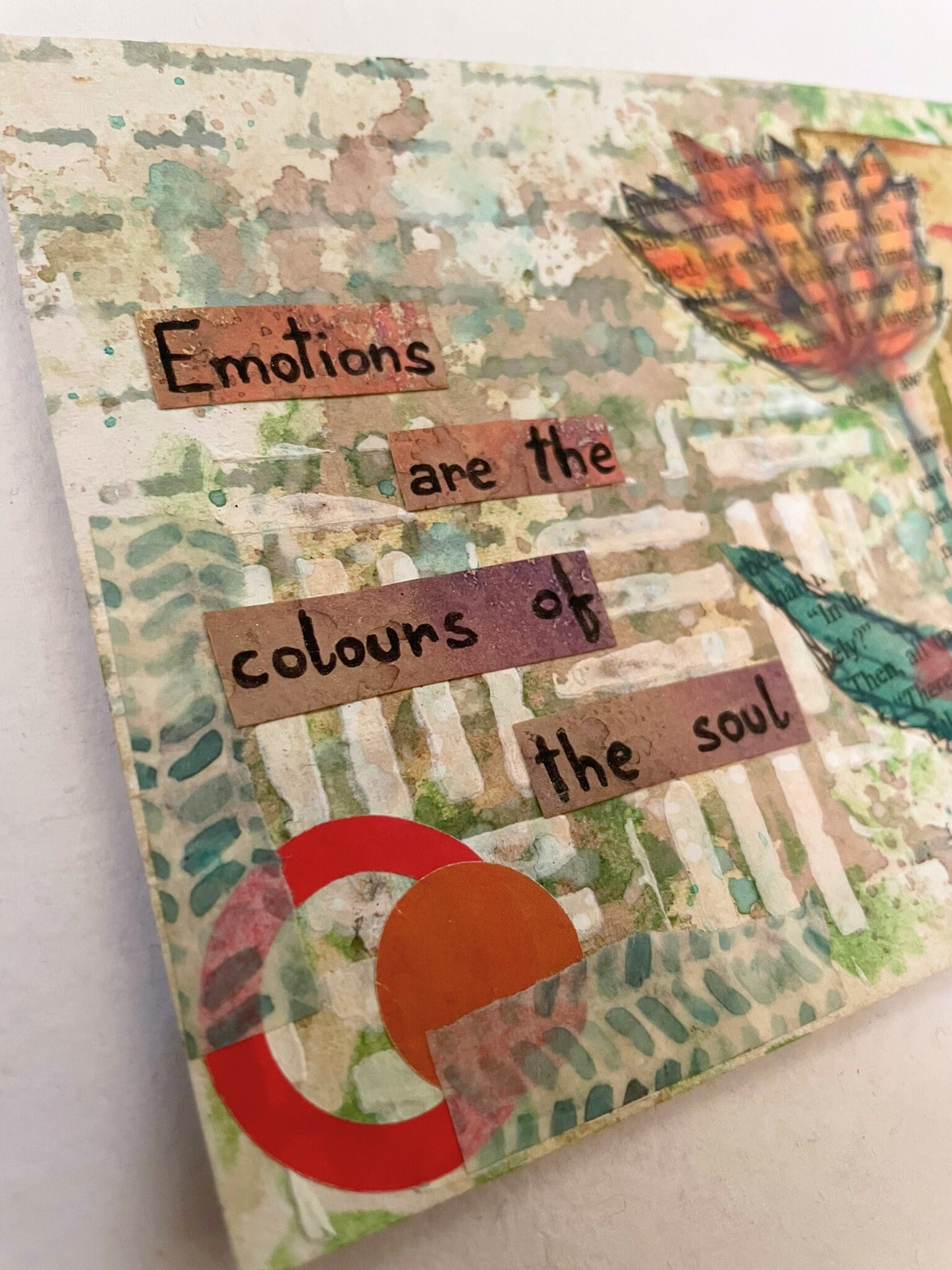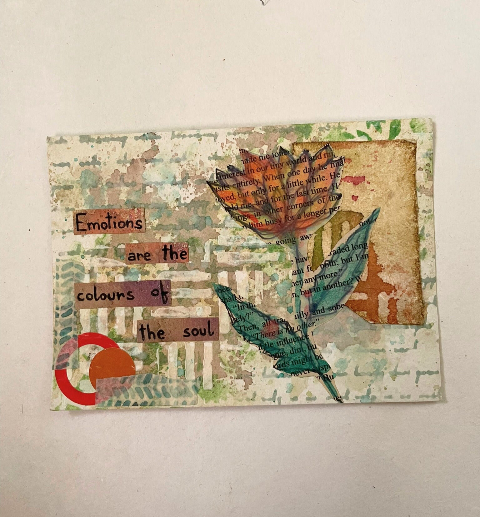 Handcrafted mixed media postcards featuring unique artistic designs created with various materials and techniques. Each card combines different textures, colours, and artistic elements to create one-of-a-kind pieces perfect for personal correspondence or as collectible art pieces.