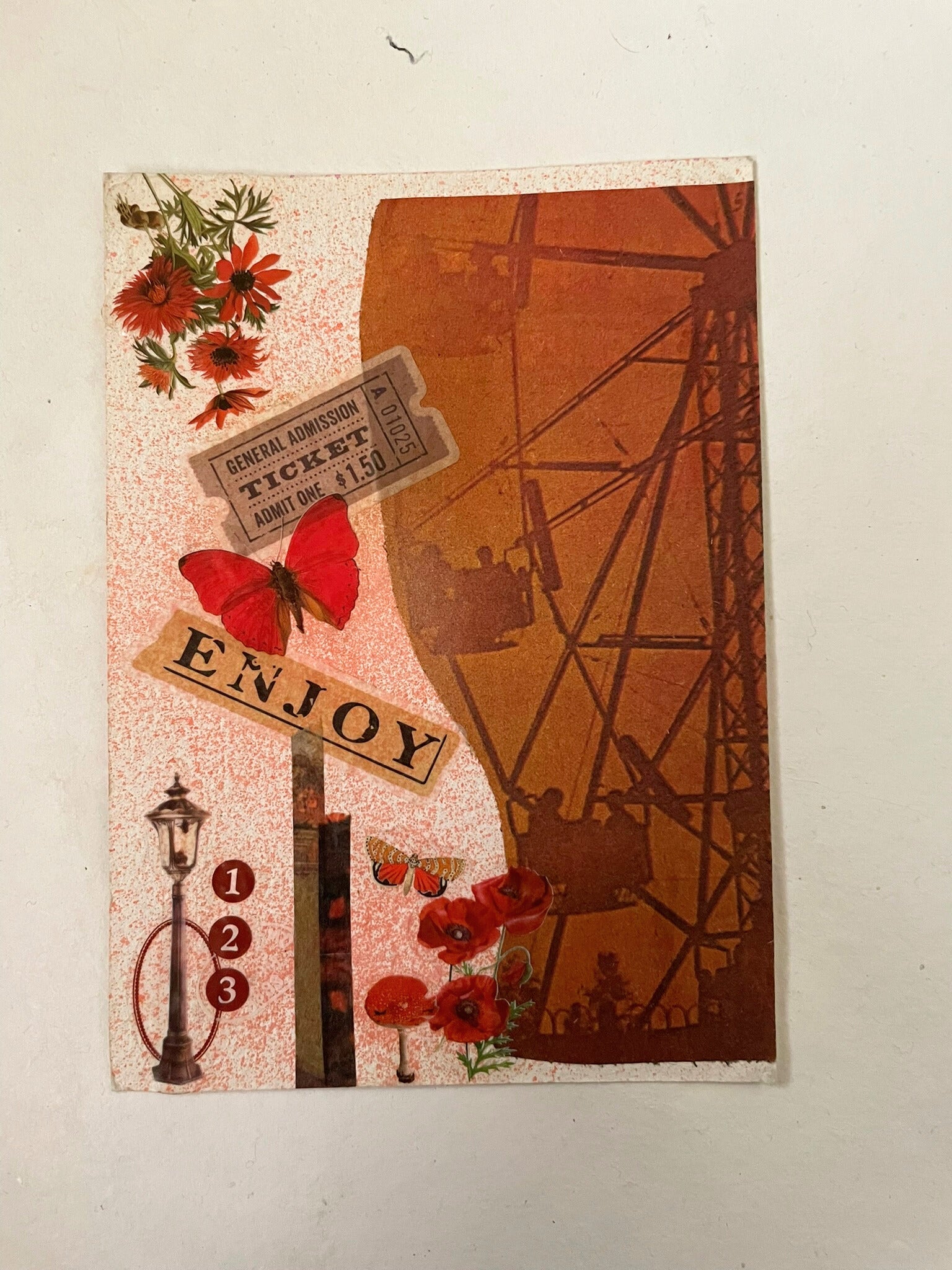 Handcrafted mixed media postcards featuring unique artistic designs created with various materials and techniques. Each card combines different textures, colours, and artistic elements to create one-of-a-kind pieces perfect for personal correspondence or as collectible art pieces.