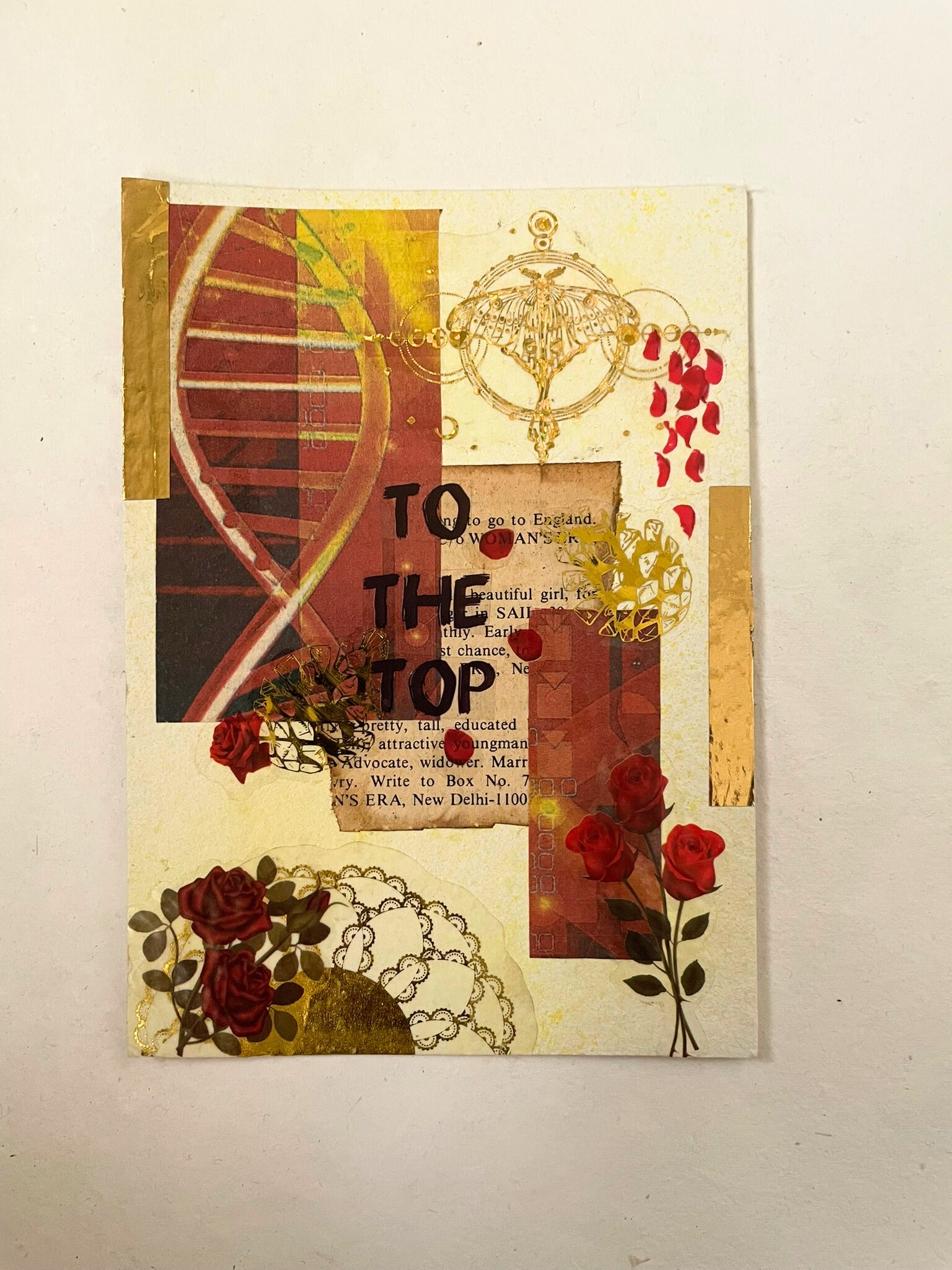 Handcrafted mixed media postcards featuring unique artistic designs created with various materials and techniques. Each card combines different textures, colours, and artistic elements to create one-of-a-kind pieces perfect for personal correspondence or as collectible art pieces.