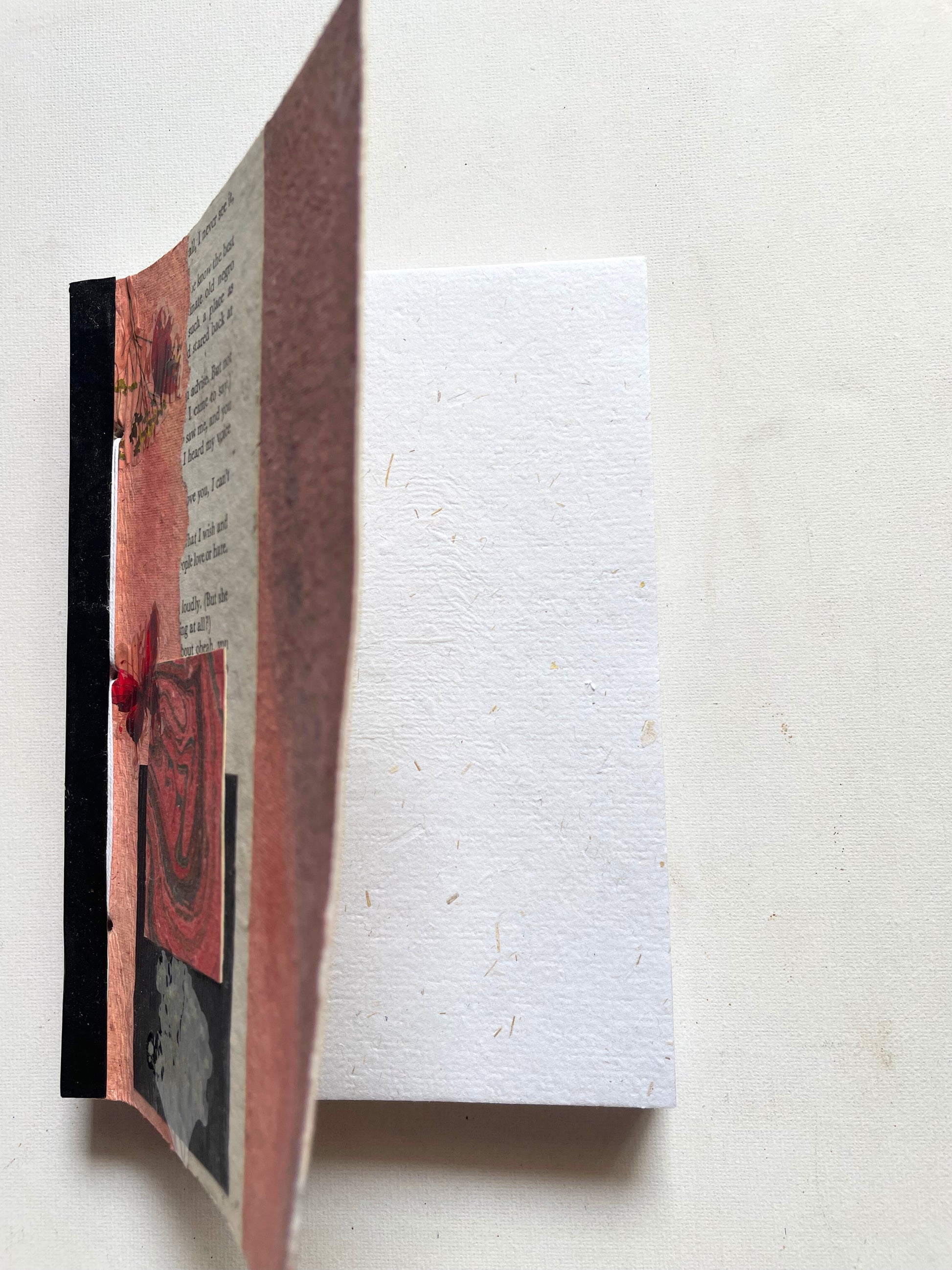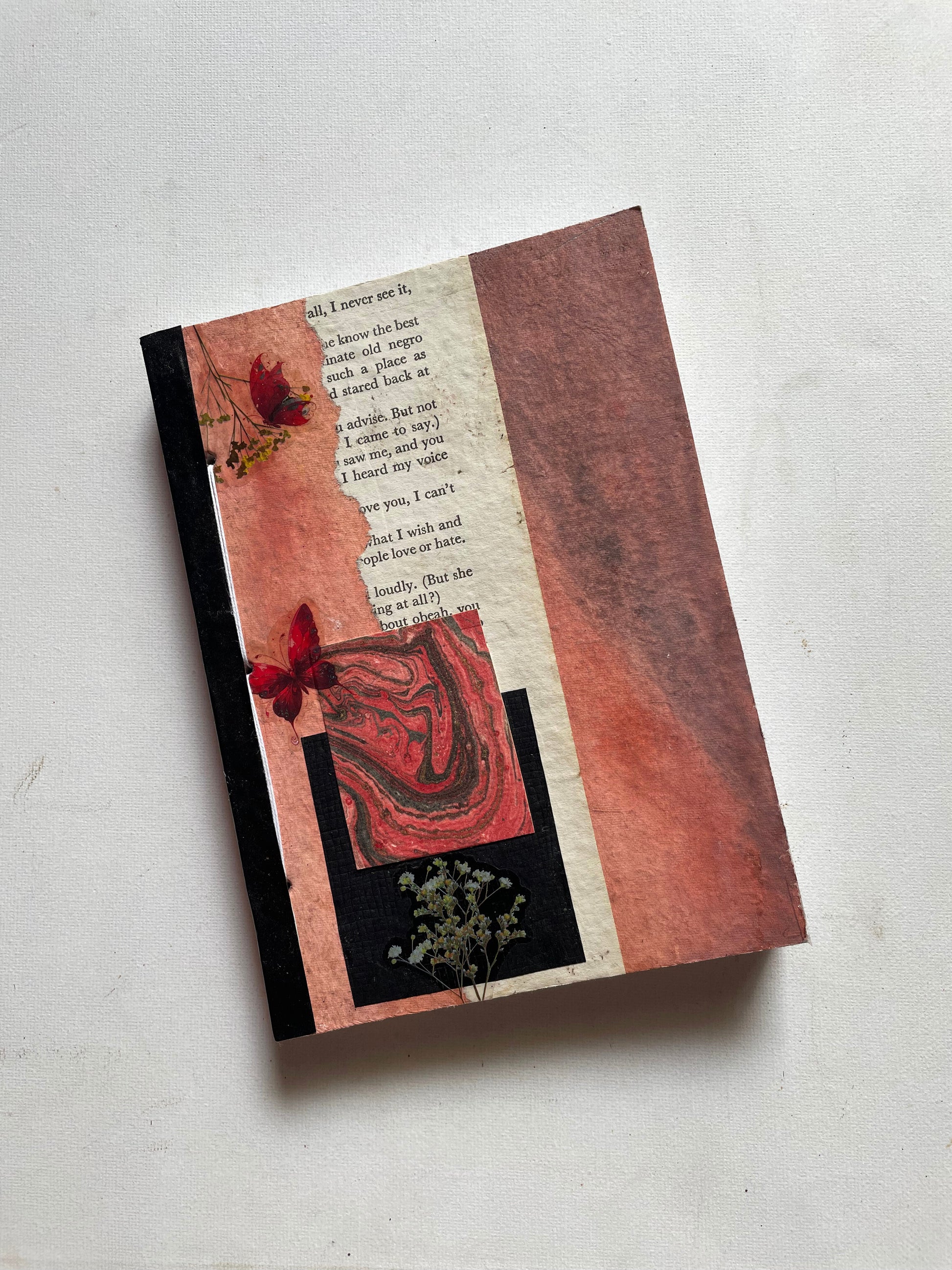 Each handcrafted notebook features a unique, mixed-media cover with its own distinct artistic themes and vintage elements, creating a tactile experience. No two are identical.