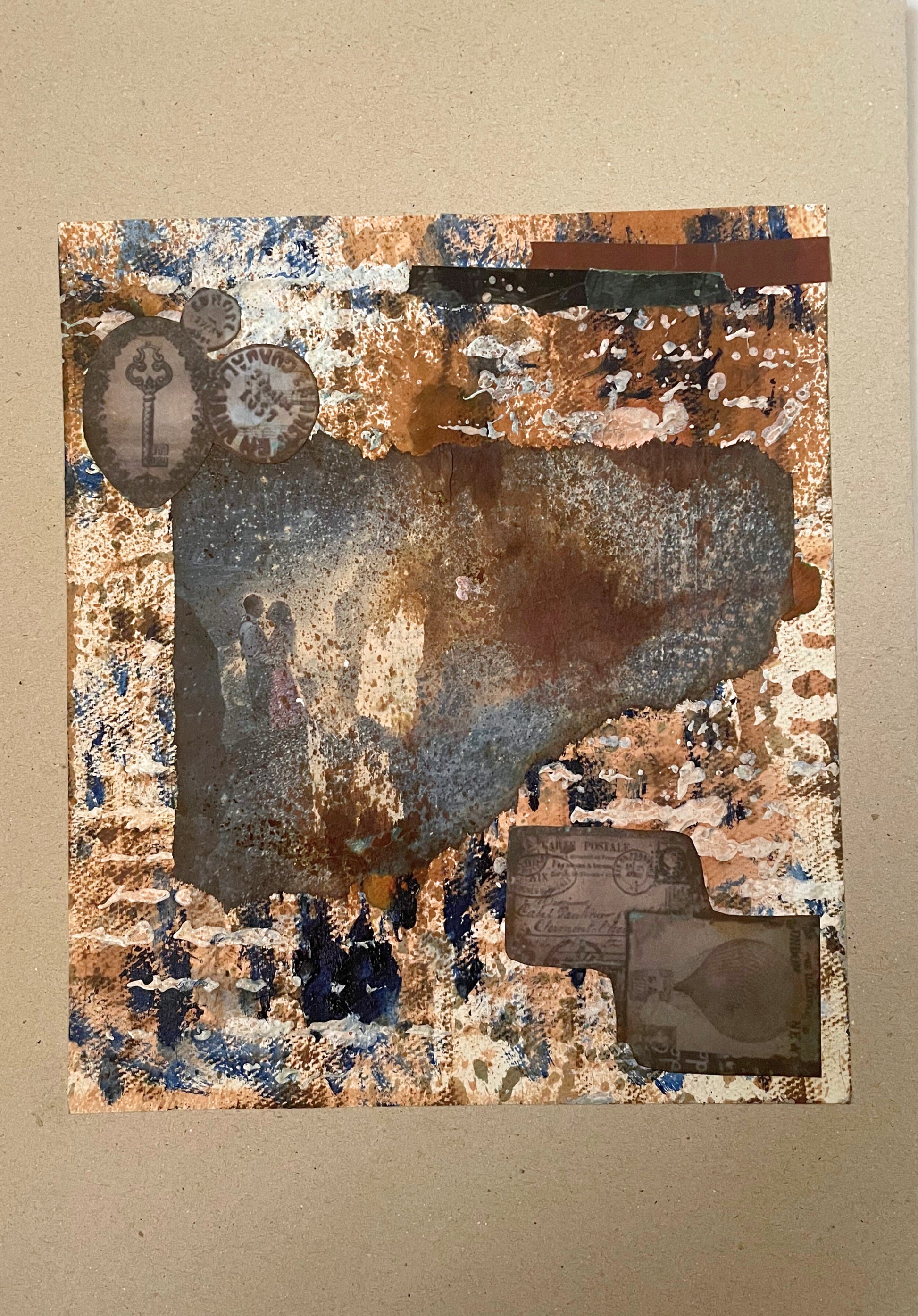Mixed media artworks combining various materials and techniques to create layered, textured compositions. These pieces blend traditional and unconventional materials - from paint and paper to fabric, metal, and found objects - resulting in dynamic, multi-dimensional works that explore depth, contrast, and visual storytelling through diverse artistic elements.