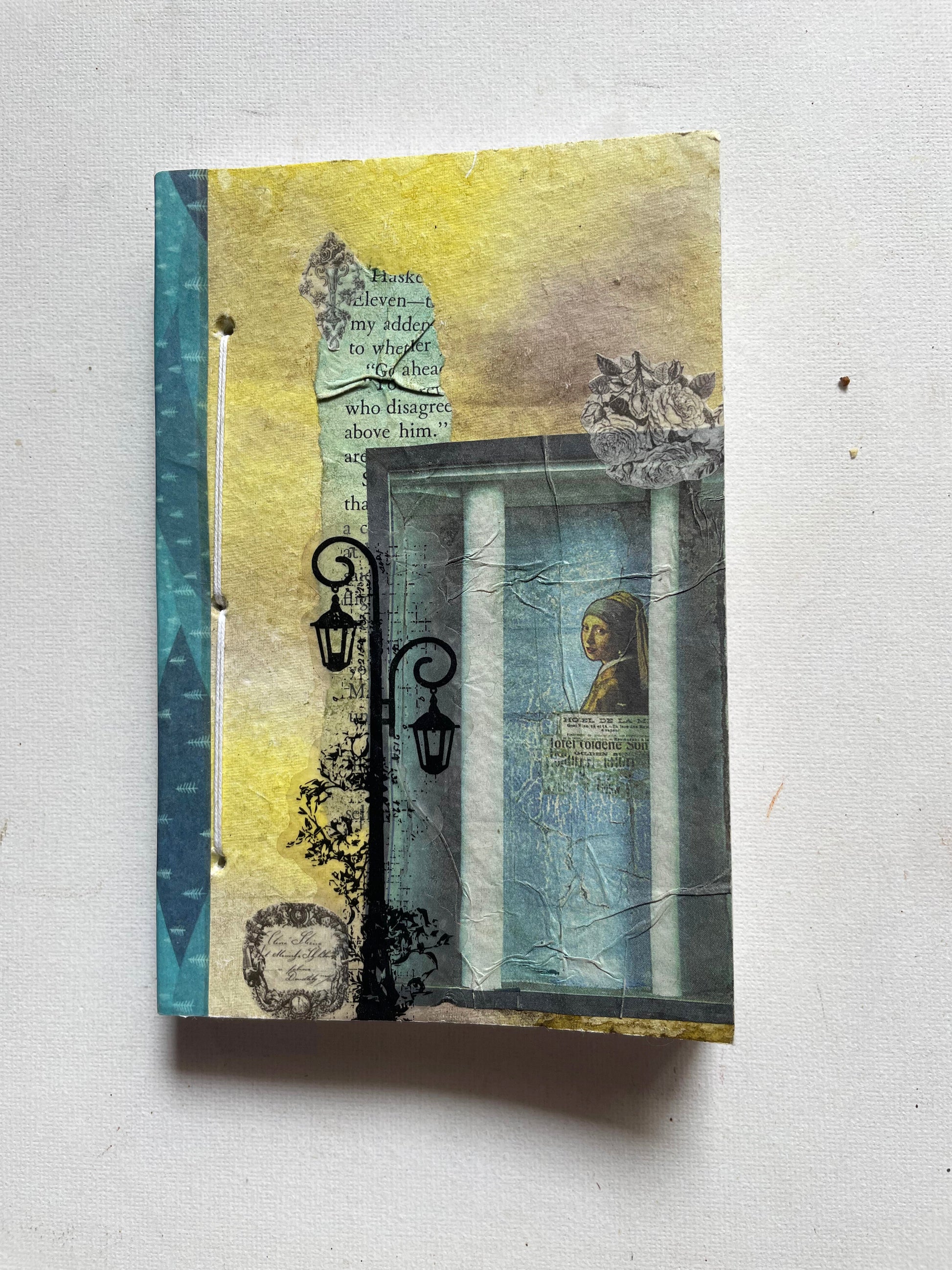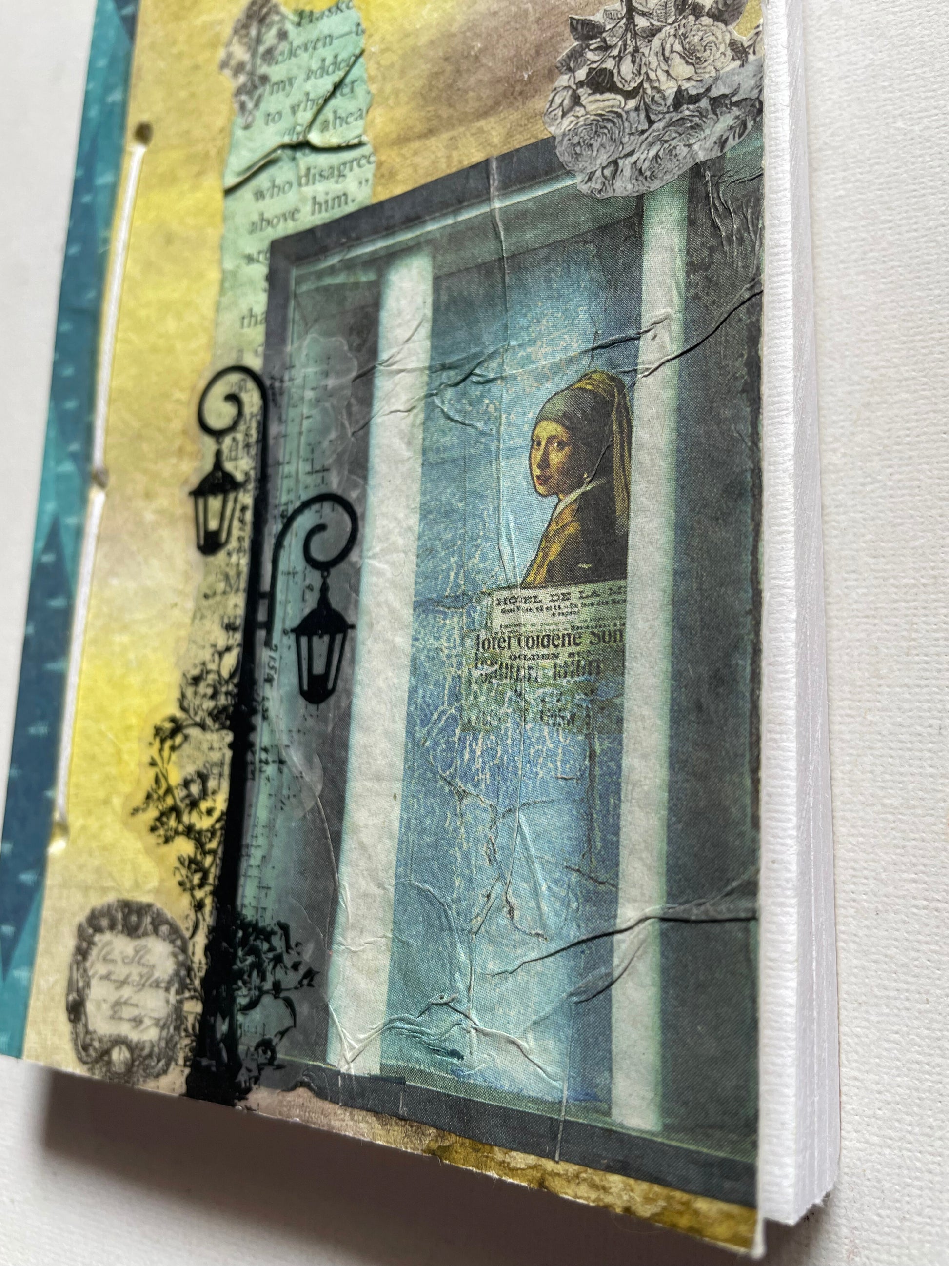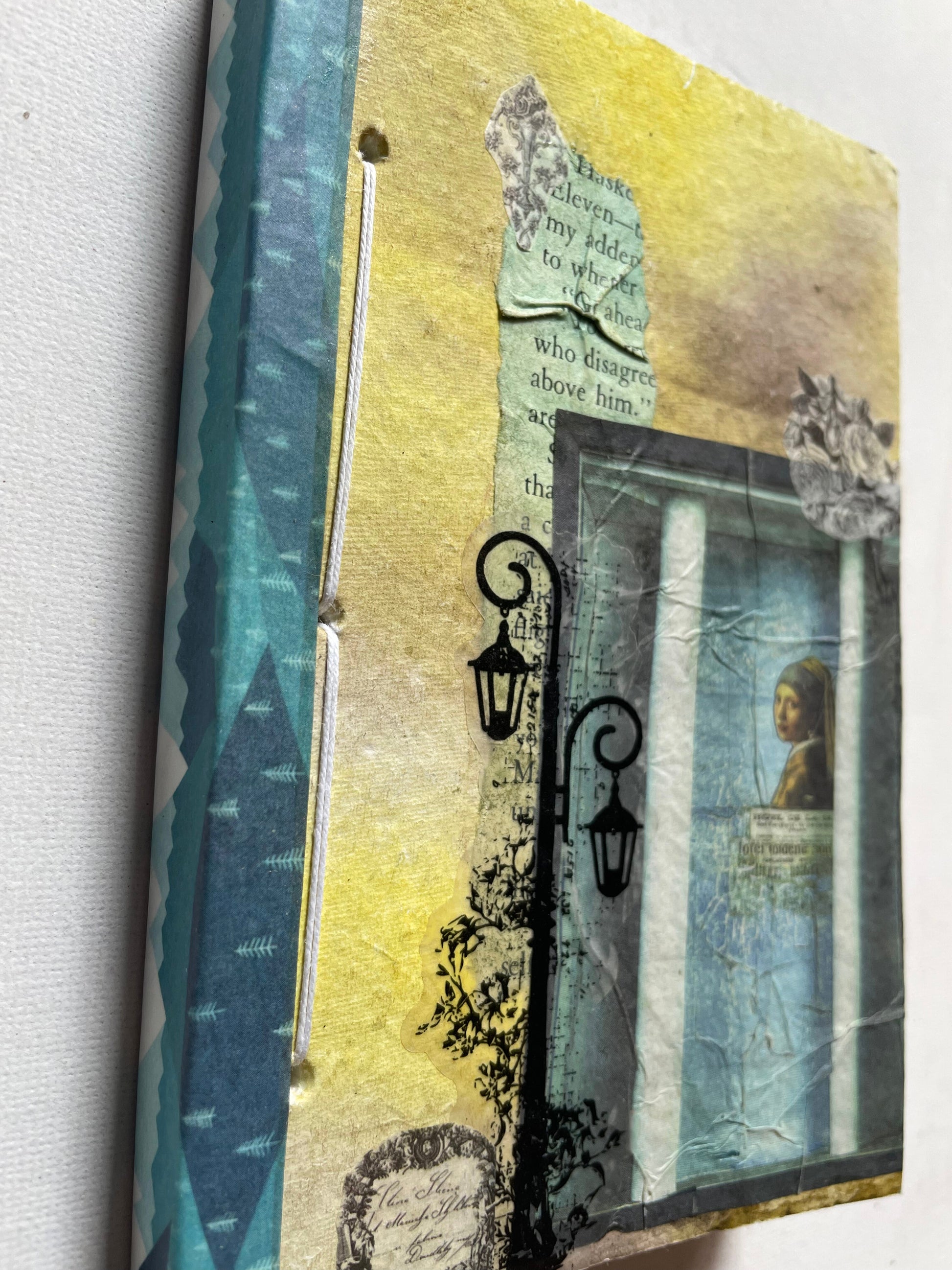 Each handcrafted notebook features a unique mixed-media cover with its own distinct artistic theme, with vintage elements to create a tactile experience. No two are identical.
