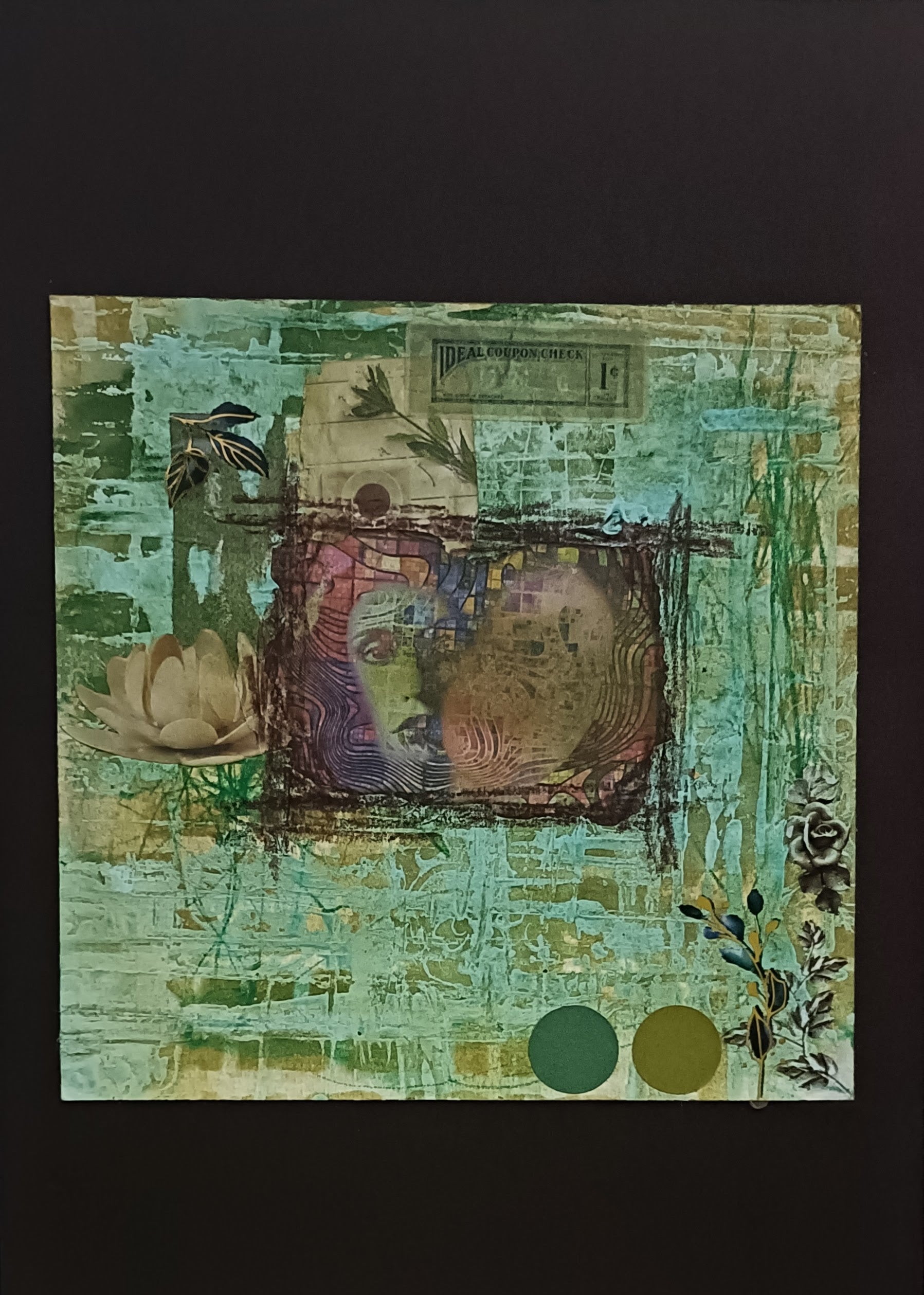 Mixed media artworks combining various materials and techniques to create layered, textured compositions. These pieces blend traditional and unconventional materials - from paint and paper to fabric, metal, and found objects - resulting in dynamic, multi-dimensional works that explore depth, contrast, and visual storytelling through diverse artistic elements.