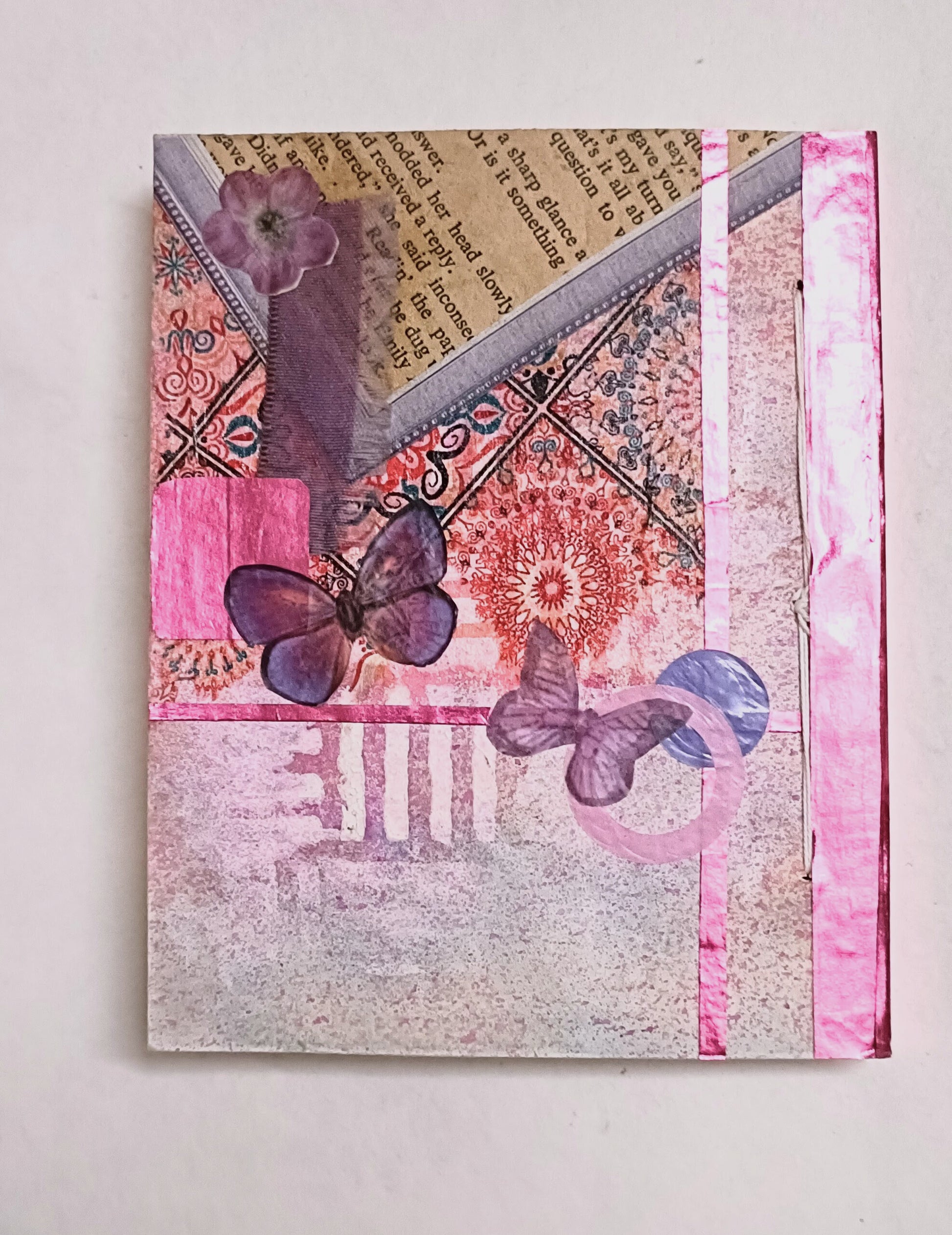Each handcrafted notebook features unique, mixed-media front and back covers with their own distinct artistic themes and vintage elements, creating a tactile experience. No two are identical.