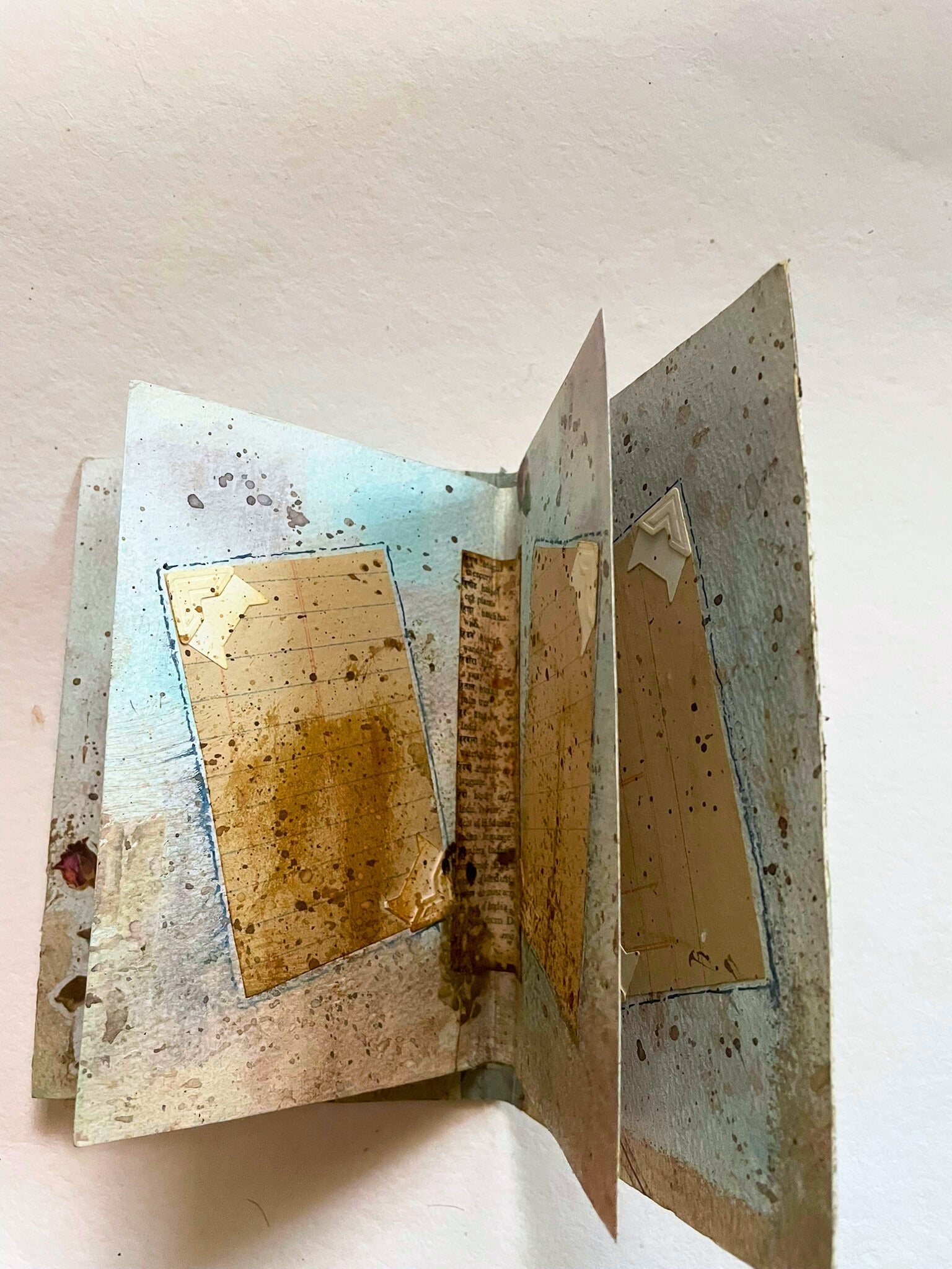 Handcrafted mixed media albums featuring artistic covers created with layered materials and textures. These unique memory books combine various artistic elements - papers, fabrics, embellishments, and mixed techniques - to create personalized keepsake albums perfect for preserving photos, memories, and special moments with distinctive artistic flair.