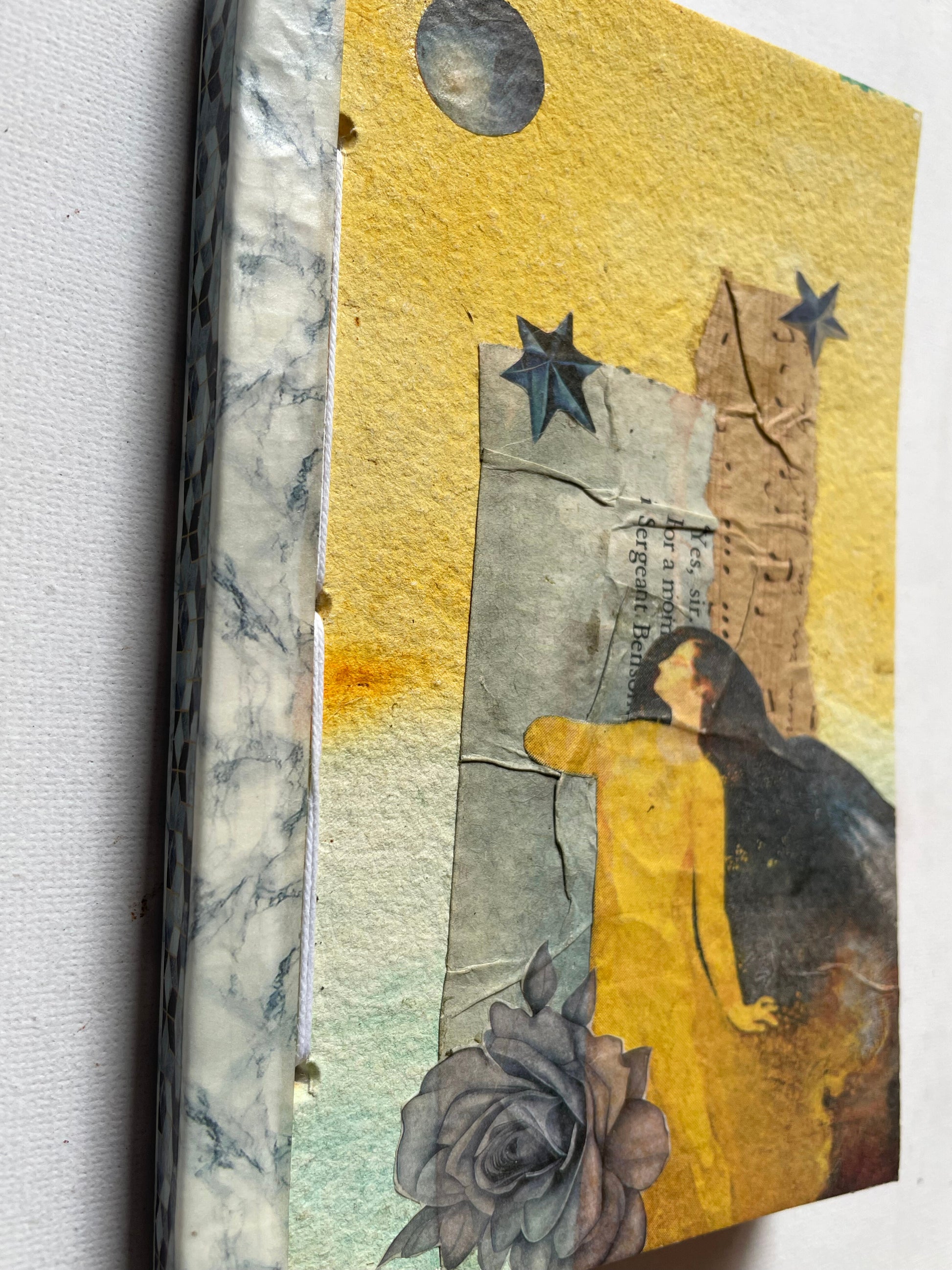 Each handcrafted notebook features a unique mixed-media cover with its own distinct artistic theme, with vintage elements to create a tactile experience. No two are identical.