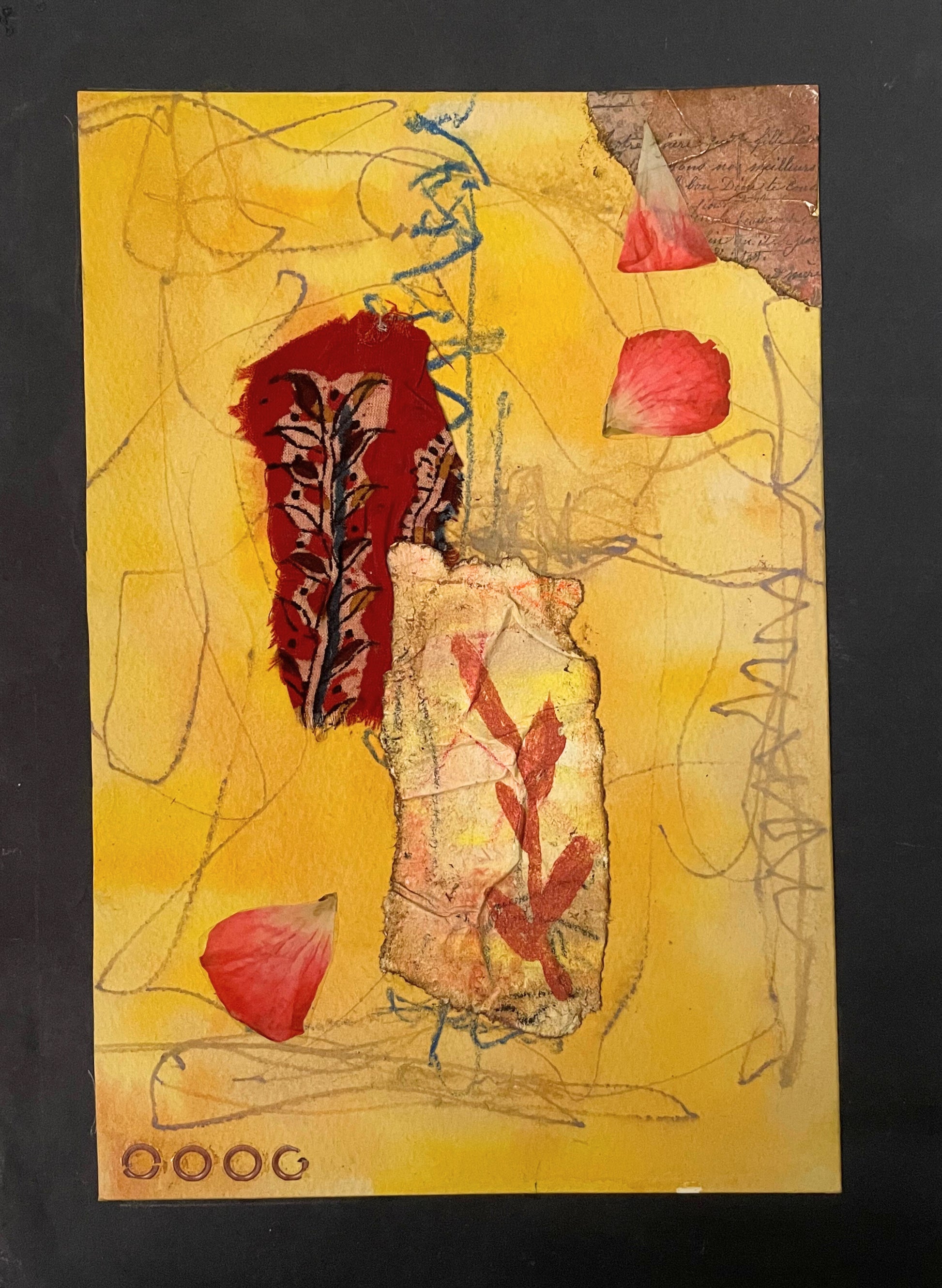 Mixed media artworks combining various materials and techniques to create layered, textured compositions. These pieces blend traditional and unconventional materials - from paint and paper to fabric, metal, and found objects - resulting in dynamic, multi-dimensional works that explore depth, contrast, and visual storytelling through diverse artistic elements.