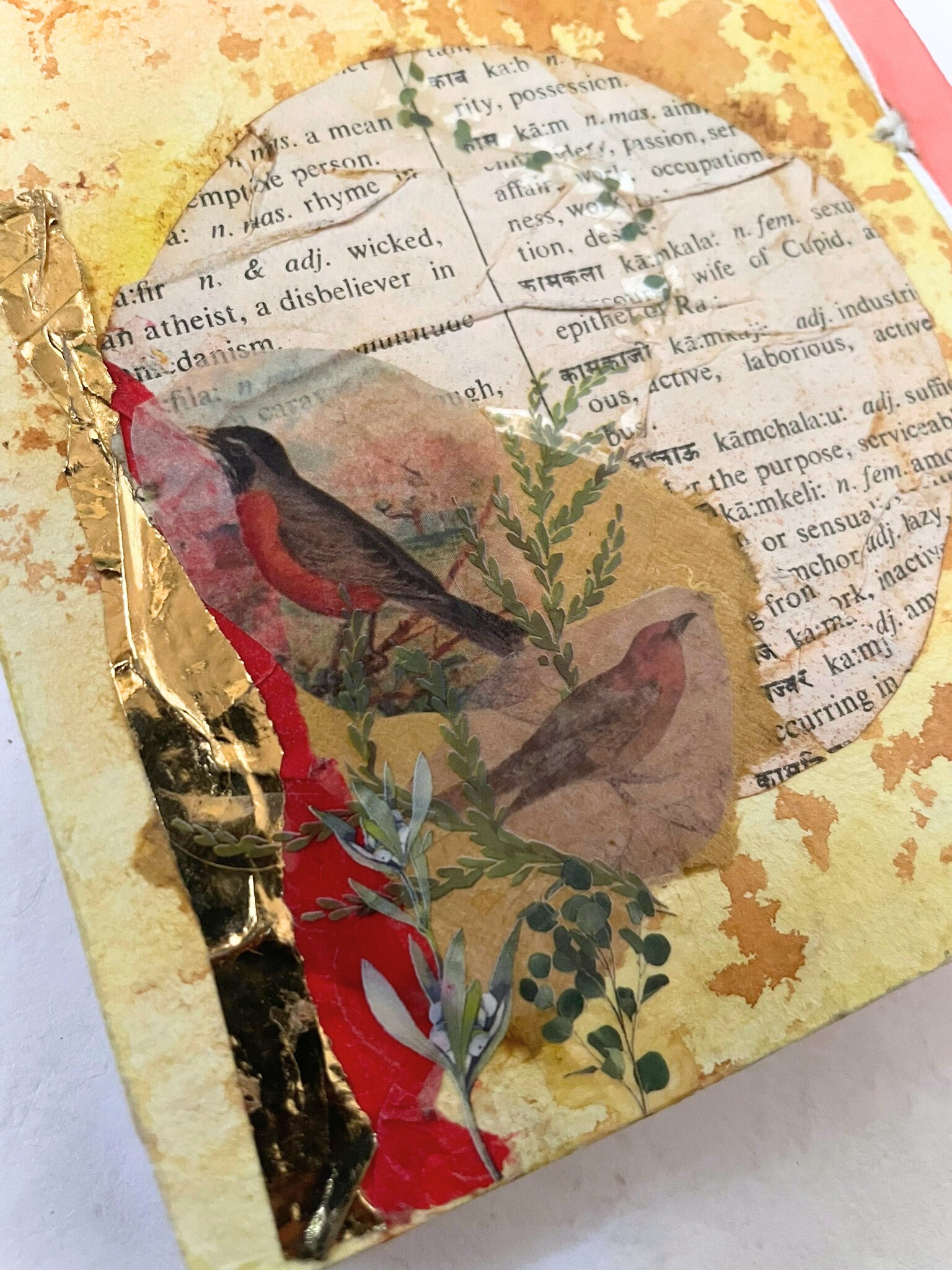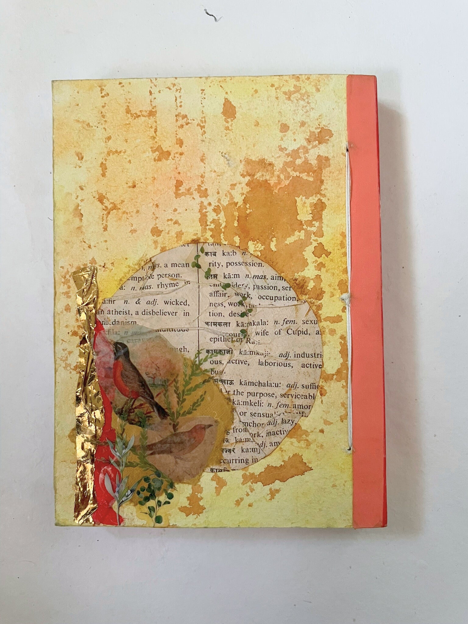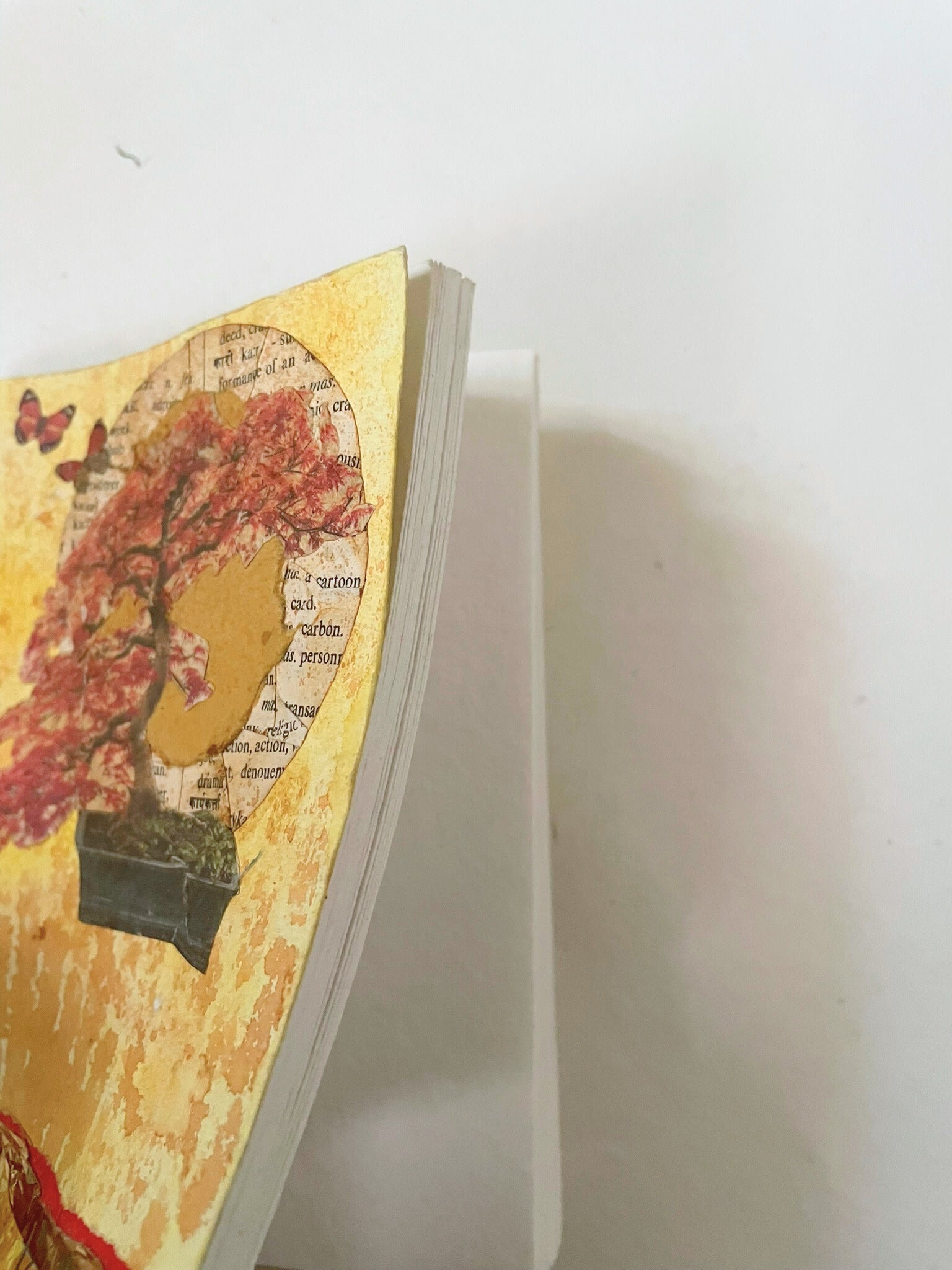 Each handcrafted notebook features unique, mixed-media front and back covers with their own distinct artistic themes and vintage elements, creating a tactile experience. No two are identical.