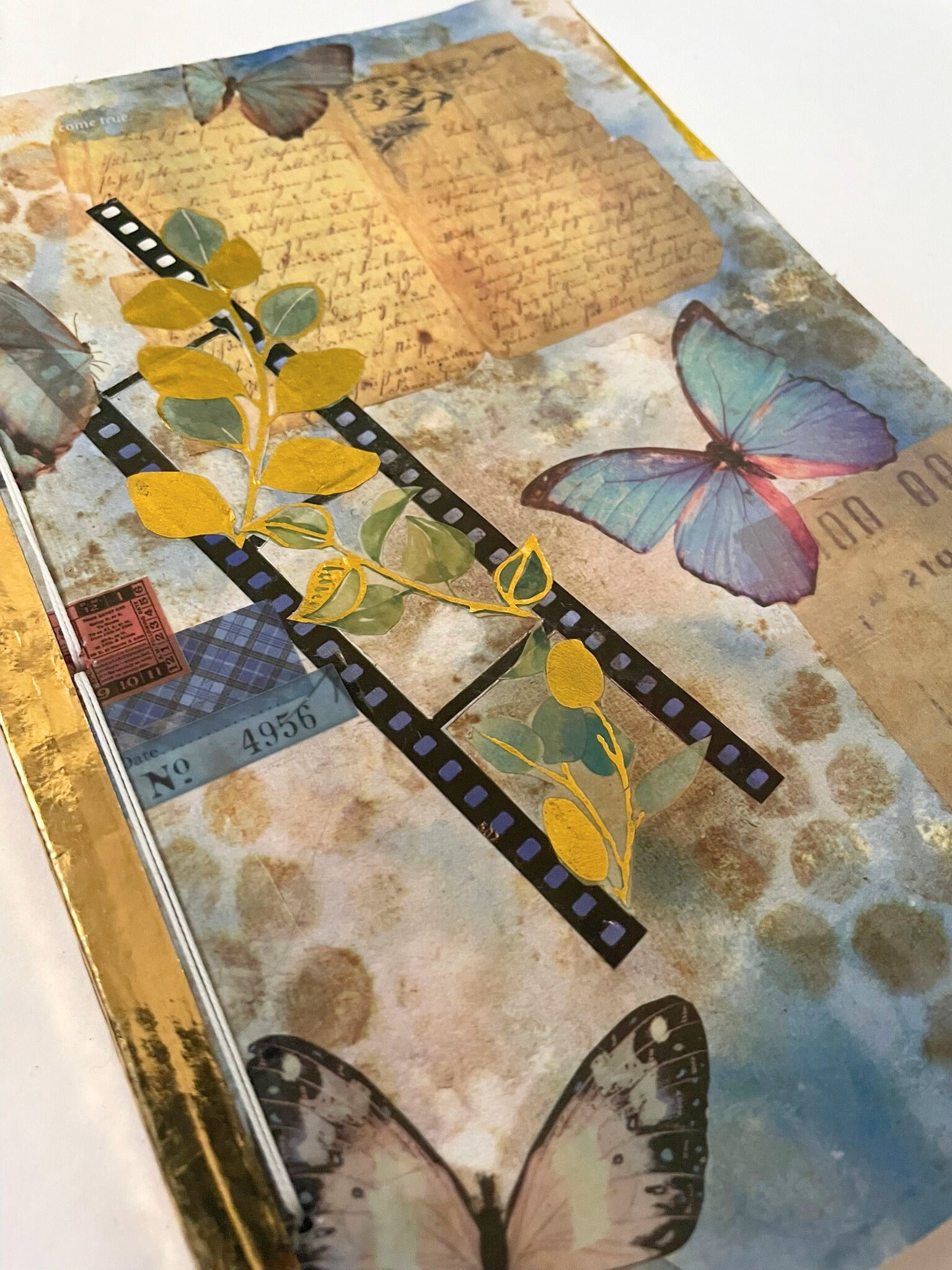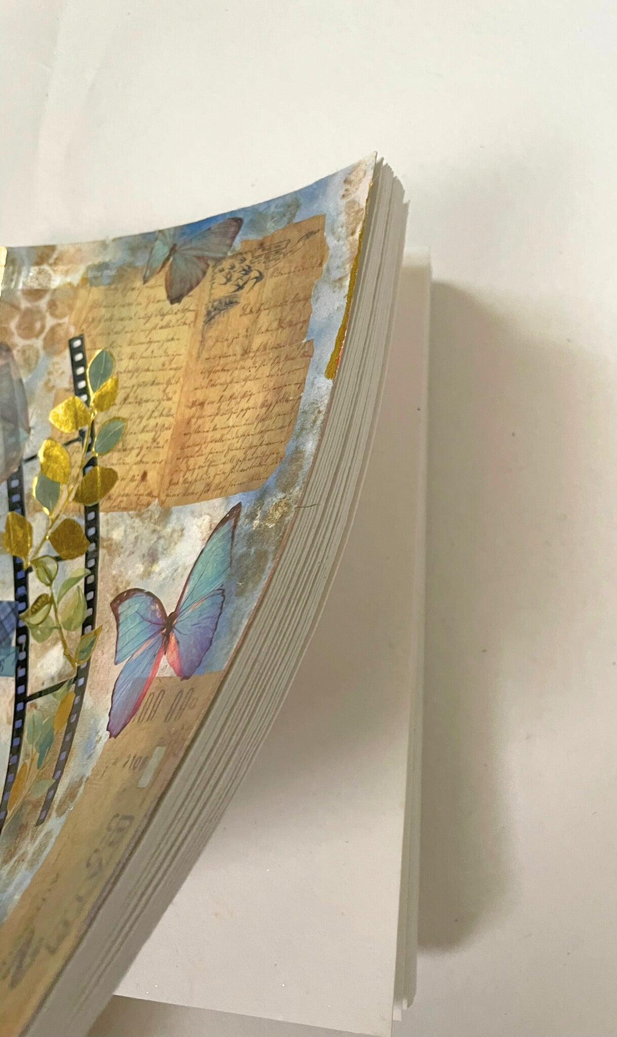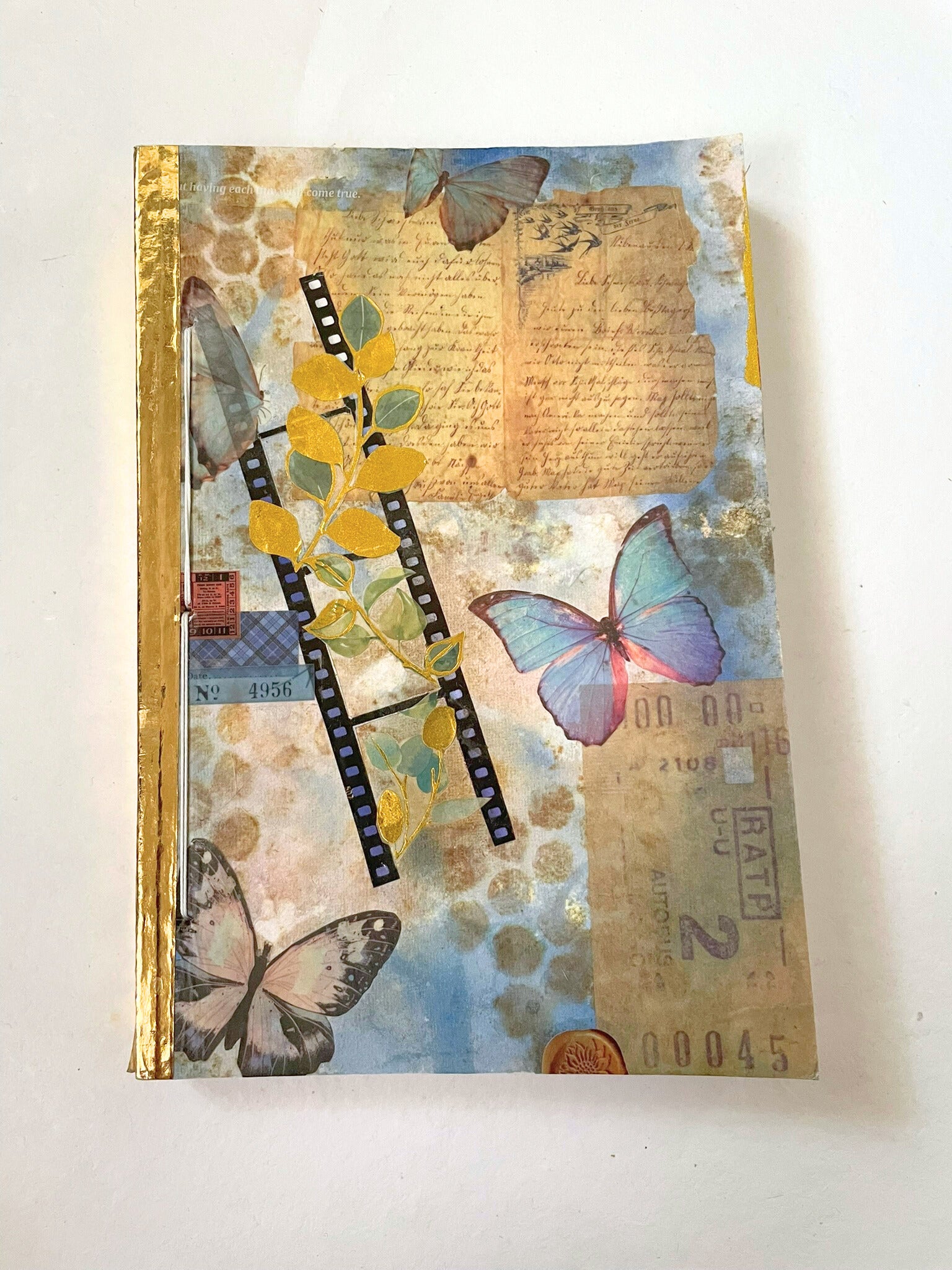 Each handcrafted notebook features a unique, mixed-media cover with its own distinct artistic themes and vintage elements, creating a tactile experience. No two are identical.