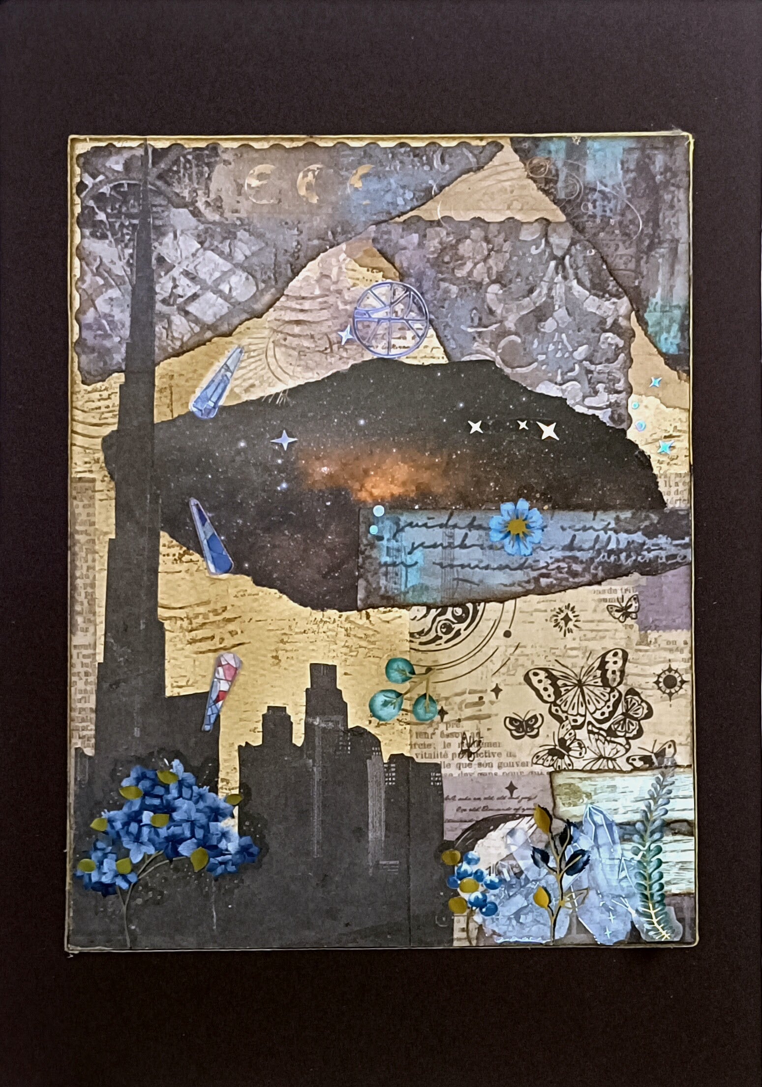 Mixed media artworks combining various materials and techniques to create layered, textured compositions. These pieces blend traditional and unconventional materials - from paint and paper to fabric, metal, and found objects - resulting in dynamic, multi-dimensional works that explore depth, contrast, and visual storytelling through diverse artistic elements.